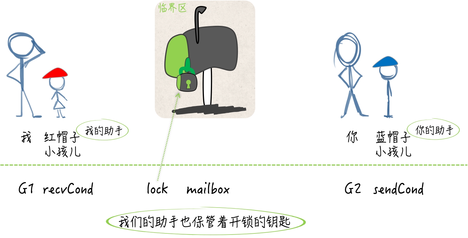 现在有四个变量。一个是代表信箱的mailbox,一个是代表信箱上的锁的lock。还有两个是,代表了蓝帽子小孩儿的sendCond,以及代表了红帽子小孩儿的recvCond。