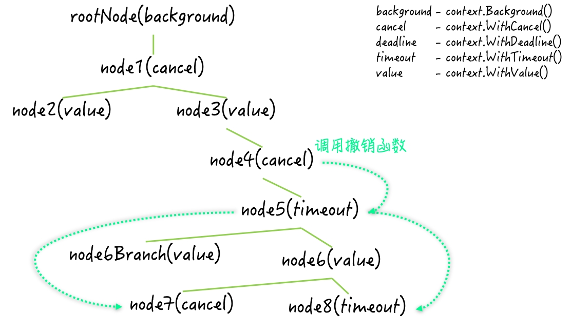 context包中还包含了四个用于繁衍Context值的函数,即:WithCancel、WithDeadline、WithTimeout和WithValue。