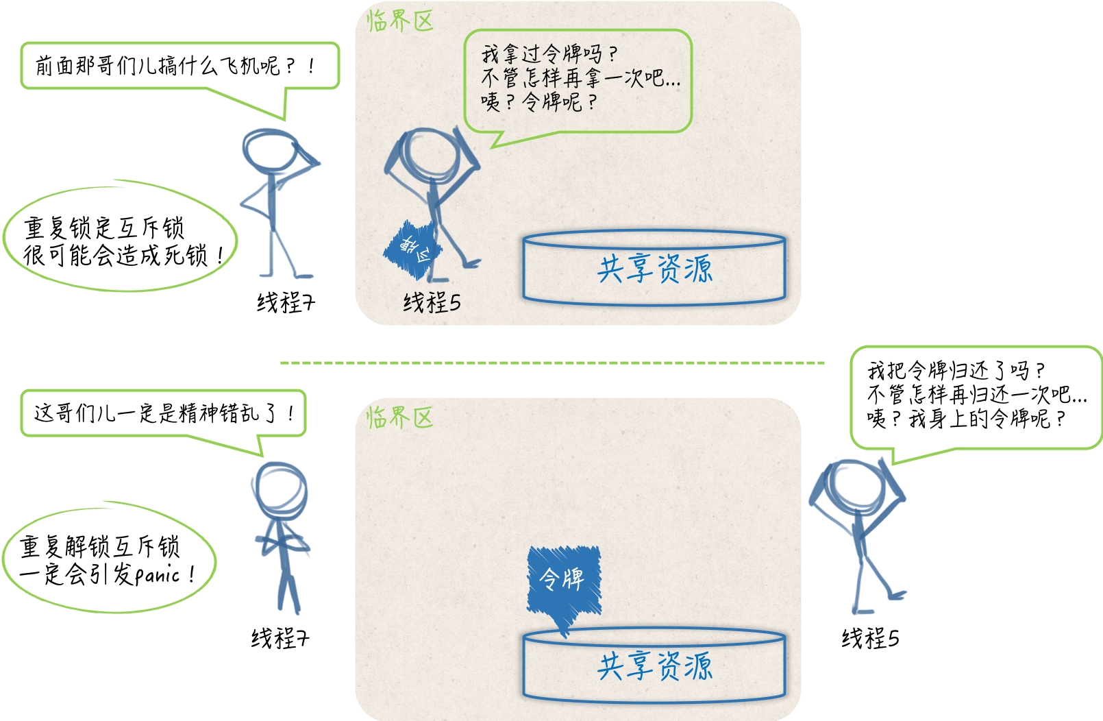 因为在一个 goroutine 执行的流程中,可能会出现诸如“锁定、解锁、再锁定、再解锁”的操作,所以如果我们忘记了中间的解锁操作,那就一定会造成重复锁定。