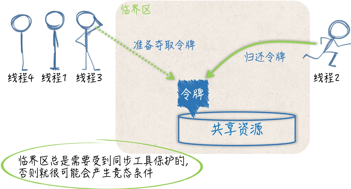 如果针对某个共享资源的访问令牌只有一块,那么在同一时刻,就最多只能有一个线程进入到那个区域,并访问到该资源。多个并发运行的线程对这个共享资源的访问是完全串行的。只要一个代码片段需要实现对共享资源的串行化访问,就可以被视为一个临界区(critical section),也就是我刚刚说的,由于要访问到资源而必须进入的那个区域。