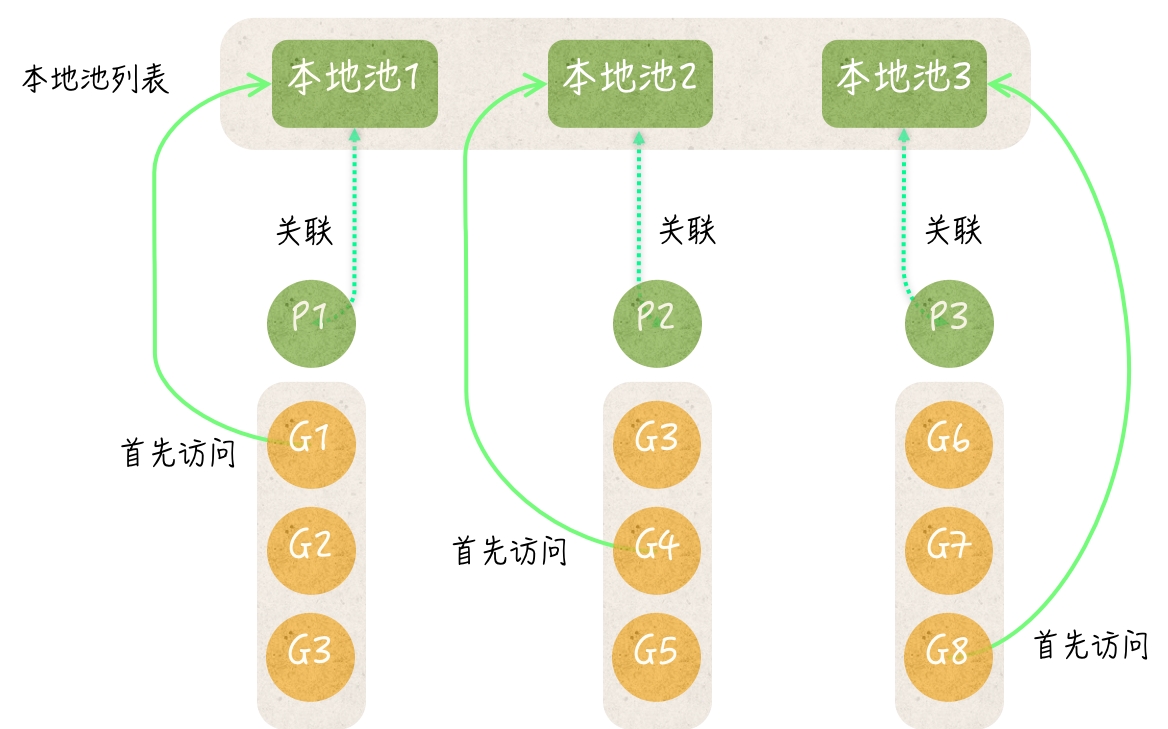 实际上,每个本地池都对应着一个 P。我们都知道,一个 goroutine 要想真正运行就必须先与某个 P 产生关联。也就是说,一个正在运行的 goroutine 必然会关联着某个 P。
