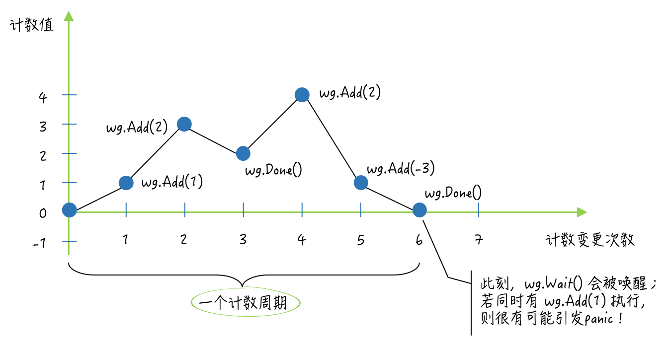 如果在一个此类值的Wait方法被执行期间,跨越了两个计数周期,那么就会引发一个 panic。