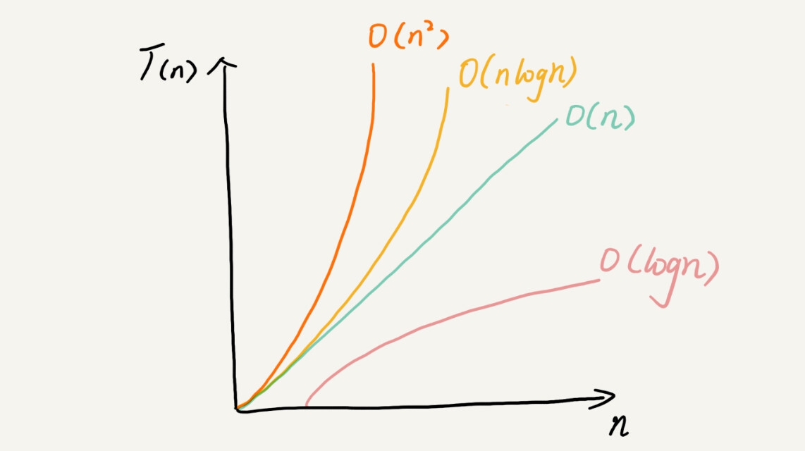 复杂度也叫渐进复杂度,包括时间复杂度和空间复杂度,用来分析算法执行效率与数据规模之间的增长关系,可以粗略地表示,越高阶复杂度的算法,执行效率越低。常见的复杂度并不多,从低阶到高阶有:O(1)、O(logn)、O(n)、O(nlogn)、O(n2)。