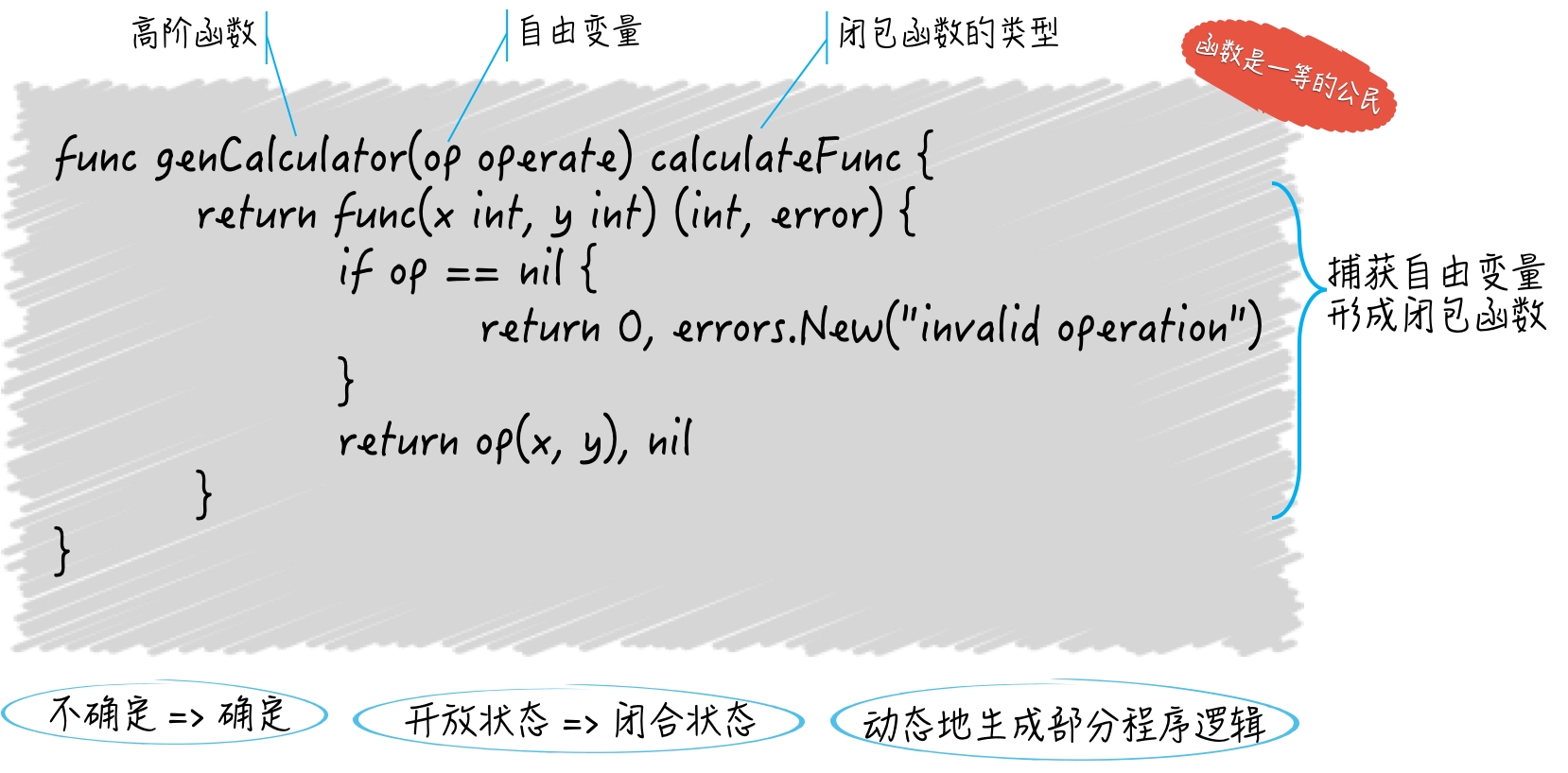 genCalculator 函数内部,实际上就实现了一个闭包,而 genCalculator 函数也是一个高阶函数,它定义一个匿名的、calculateFunc 类型的函数并把它作为结果值返回。