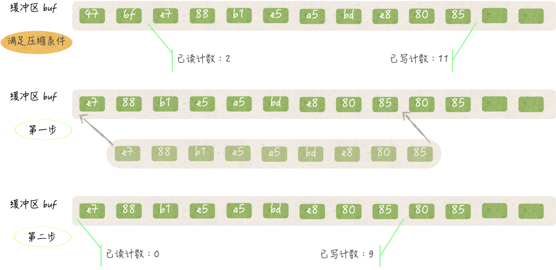 在压缩缓冲区的第二步中,fill方法会把已写计数的新值设定为原已写计数与原已读计数的差。这个差所代表的索引,就是压缩后第一次写入字节时的开始索引。