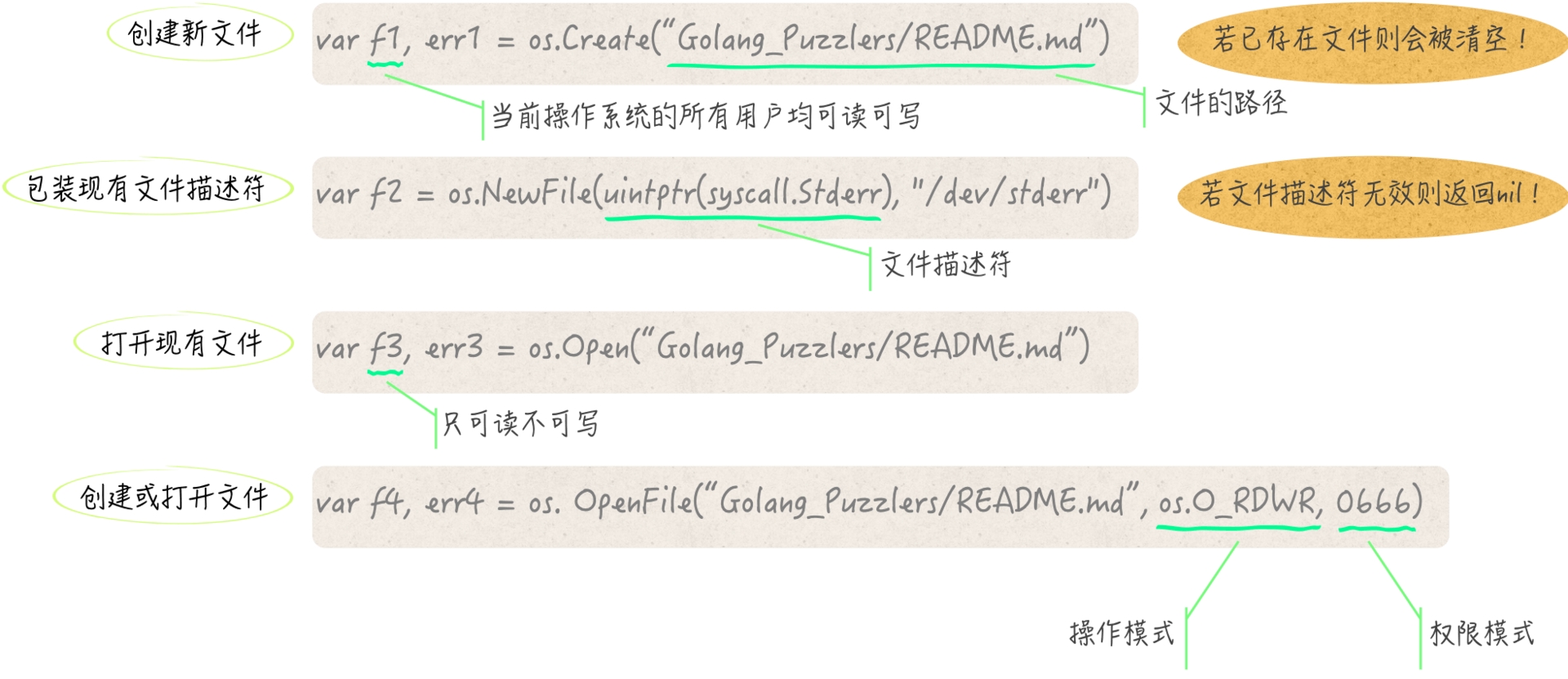 对于以上操作模式的使用,os.Create函数和os.Open函数都是现成的例子。