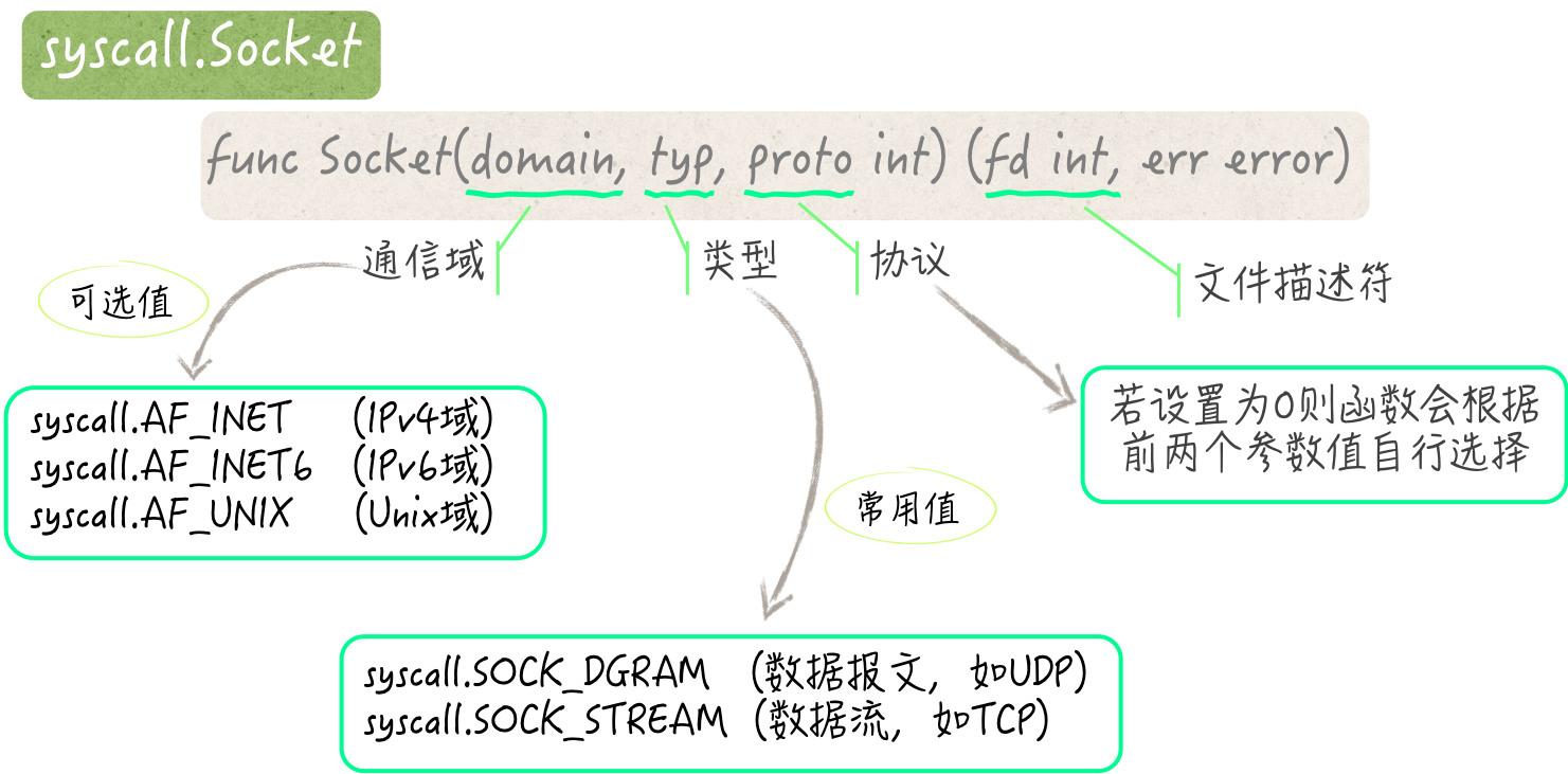 syscall.Socket函数接受的那三个参数,都是int类型的。这些参数所代表的分别是想要创建的 socket 实例通信域、类型以及使用的协议。
