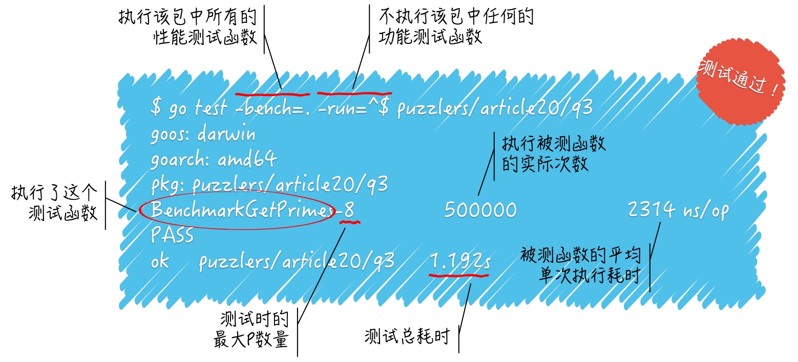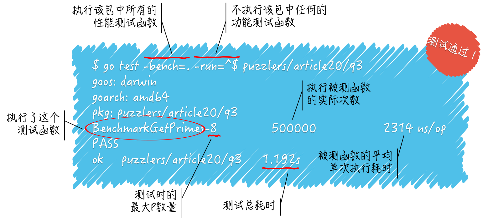 BenchmarkGetPrimes-8被称为单个性能测试的名称,它表示命令执行了性能测试函数BenchmarkGetPrimes,并且当时所用的最大 P 数量为8。