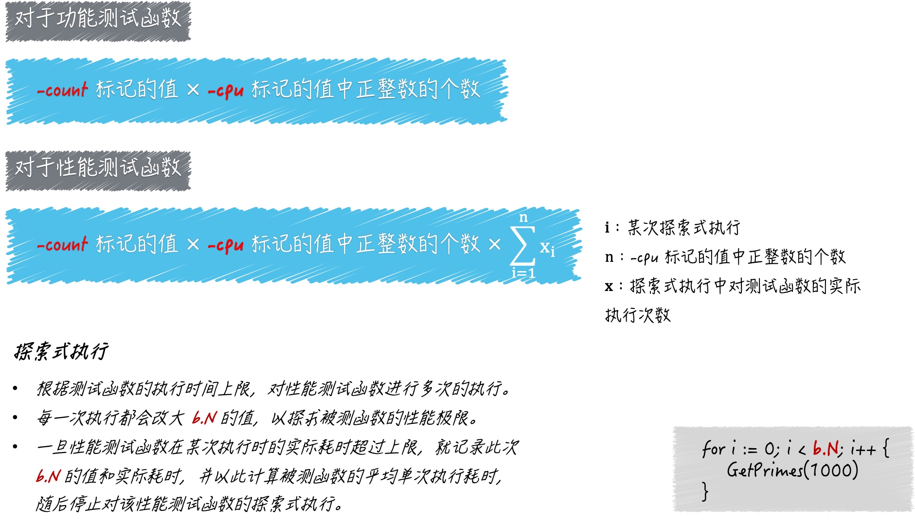 如果我们把前文所述的-cpu标记、-count标记,以及探索式执行联合起来看,就可以用一个公式来描述单个性能测试函数,在go test命令的一次运行过程中的执行次数,即: